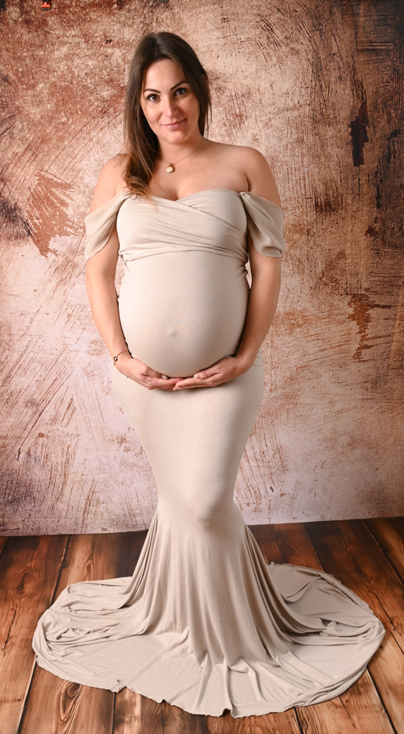 Réservez une séance grossesse avec le prêt de différentes tenues et accessoires.
